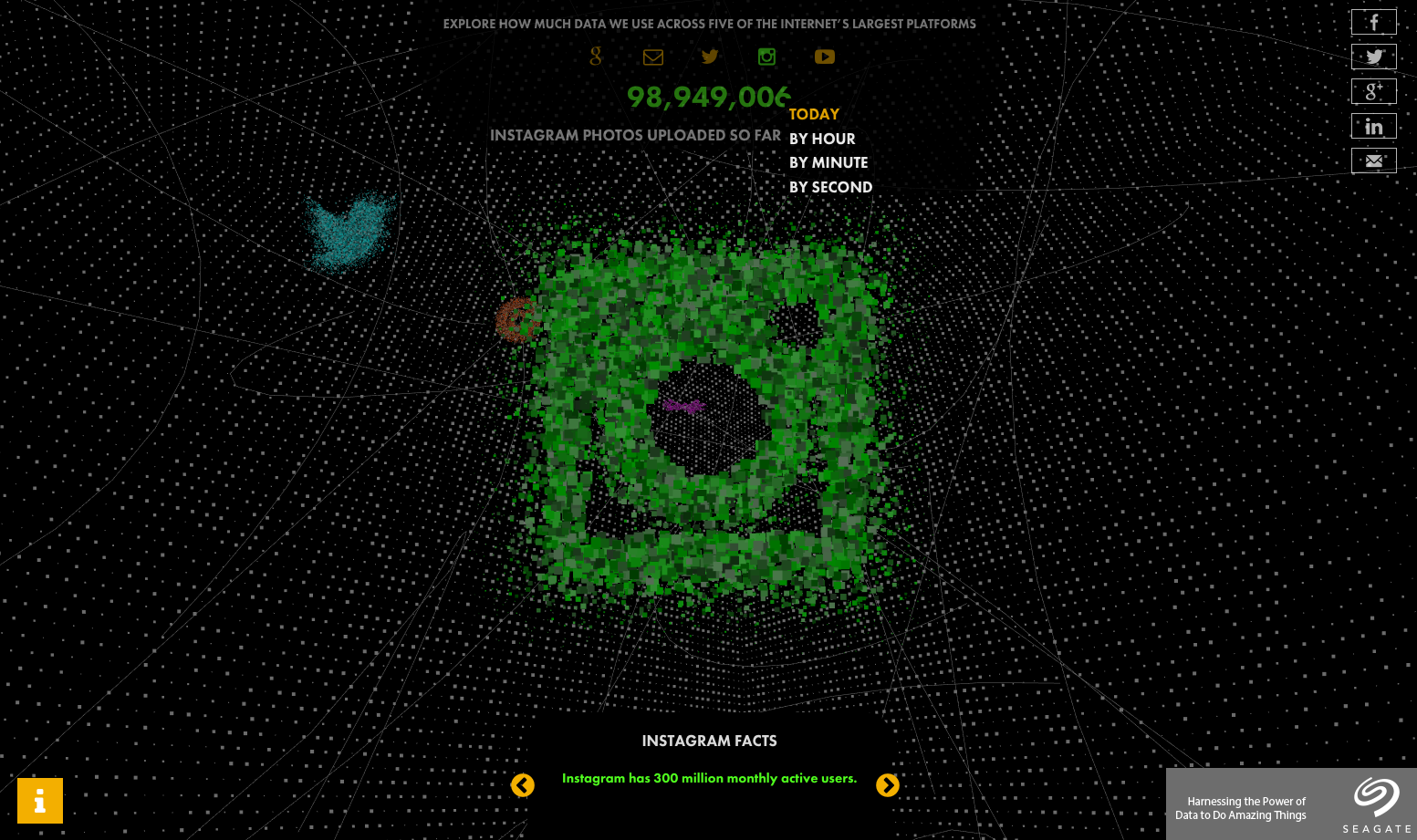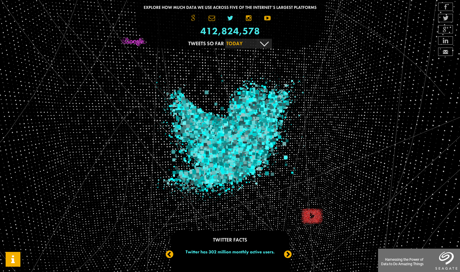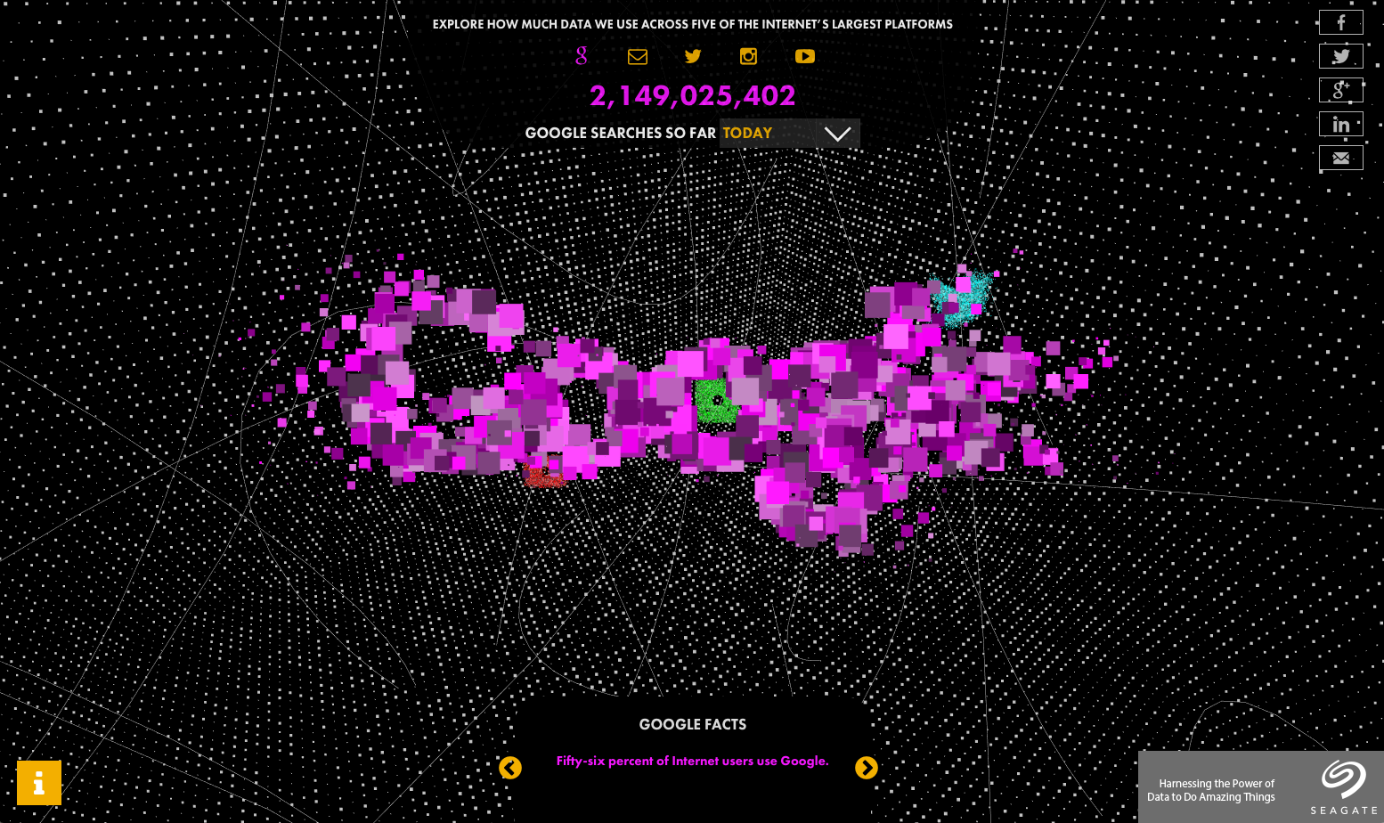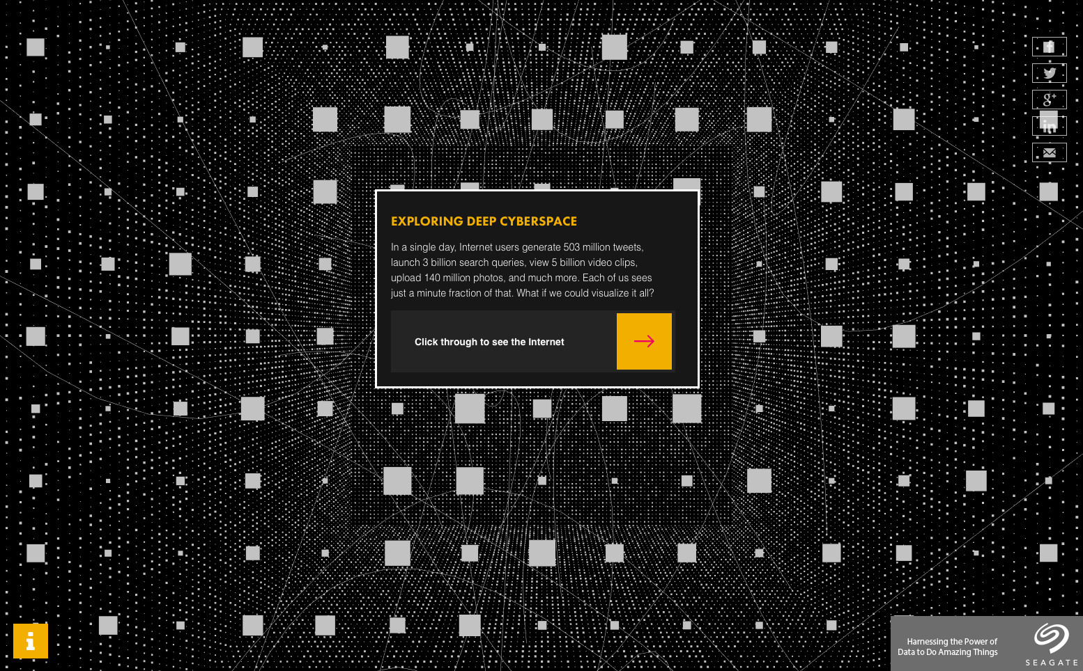 In many ways a partner piece to The Invisible Infrastructure, Exploring Deep Cyberspace — created for The Atlantic in partnership with Seagate — visualises the real-time flow of data through five of the Internet's biggest platforms.