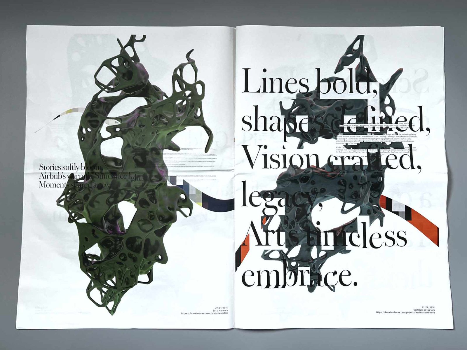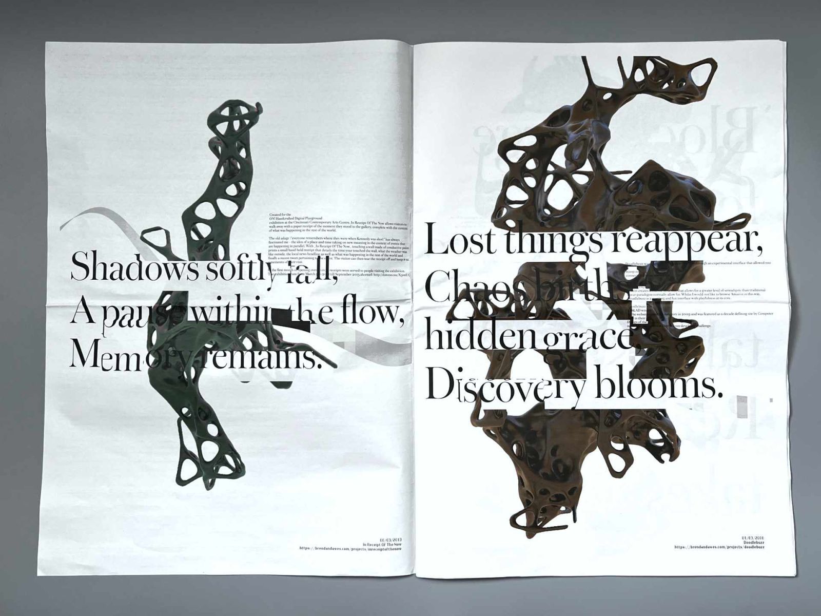 Finally, I created a compositing system which took these elements – the procedurally made sculptures, the machine generated Haiku's together with the actual project text and other data – via an API I built from my website – and outputted a series of images. Each time the system was run it would generate new compositions. The result is the publication you are now holding.