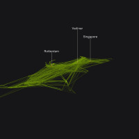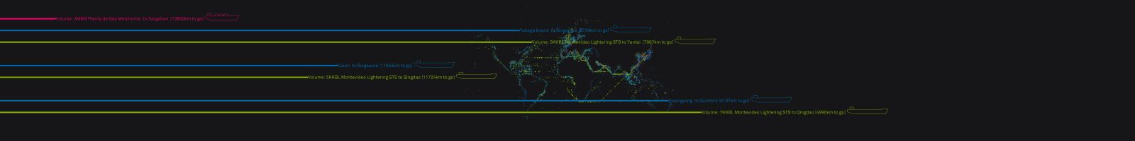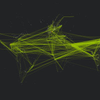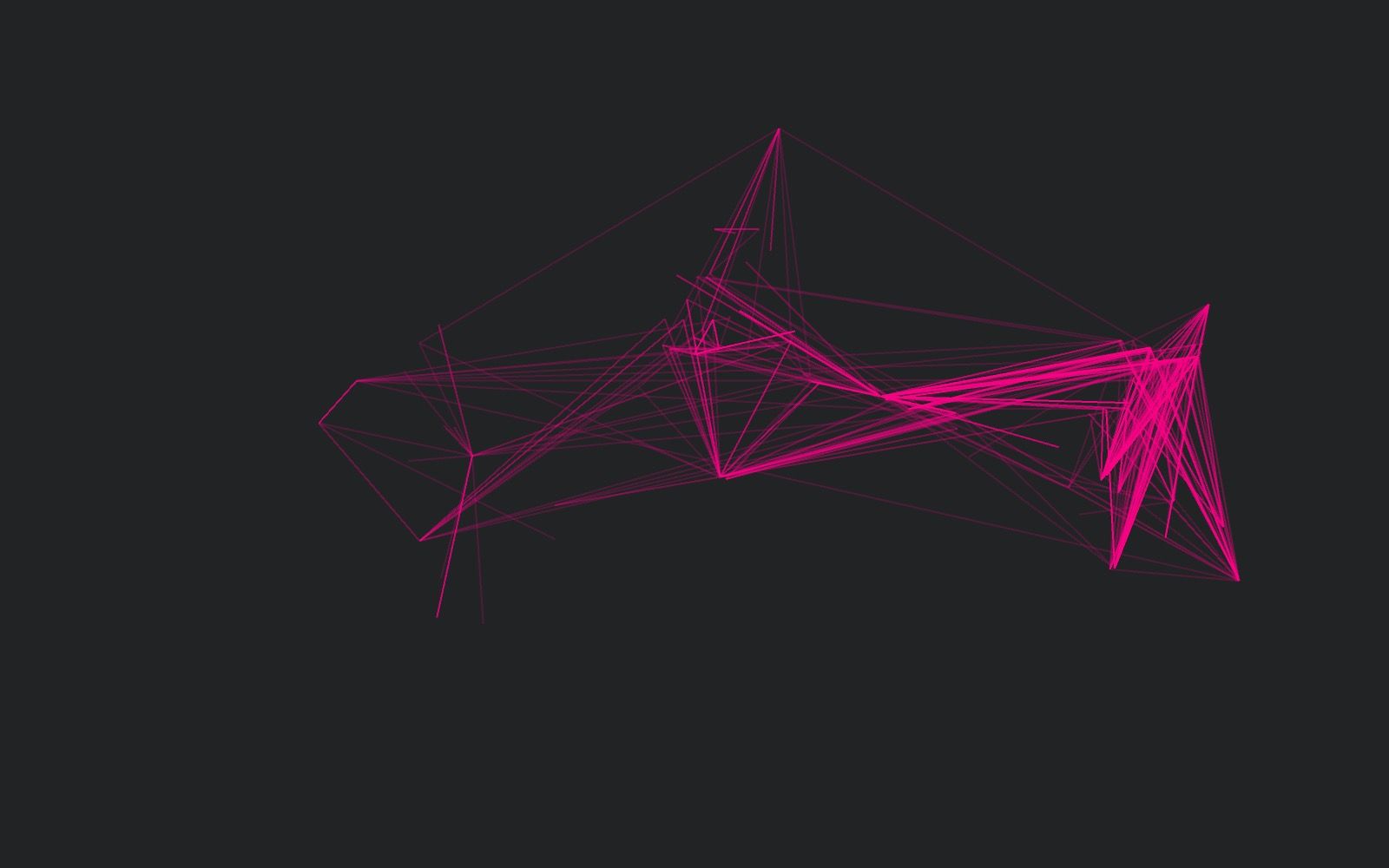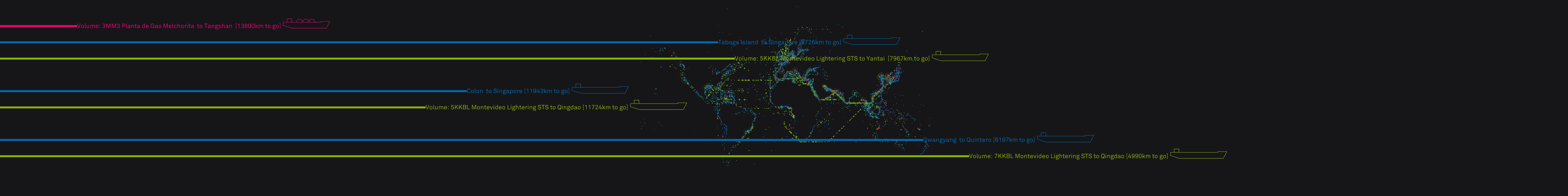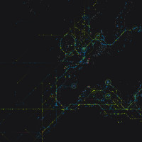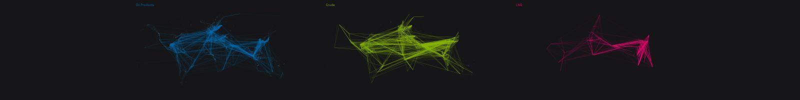 Probably my favourite parts of this project were the happy accidents that appeared as I started to play around visualising the data. Firstly there is no map displayed at any point. Instead the map of the world is creatad entirely by the small dots making up each of the ports around the world. Secondly, as I was working on a land avoidance system that the ships could follow, I created a kind of "crow flies" visualisation of various types of shipping routes, something that I thought the client wouldn't be into. As it turned out they loved these crow-flies interpretaions of their data, so much so that these graphics were used as the visual for the official invite to experience the visualisation during the oil forum event.