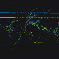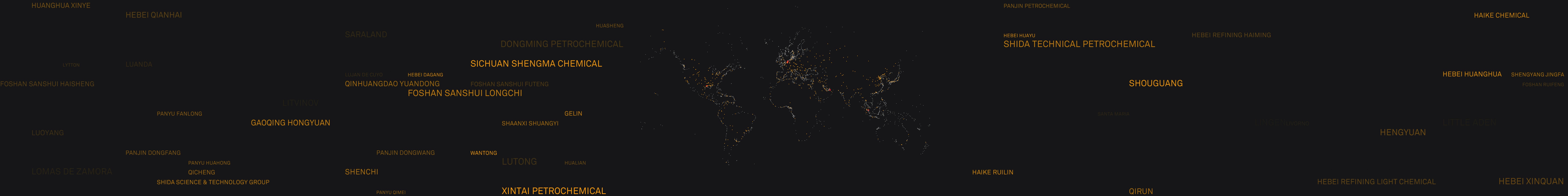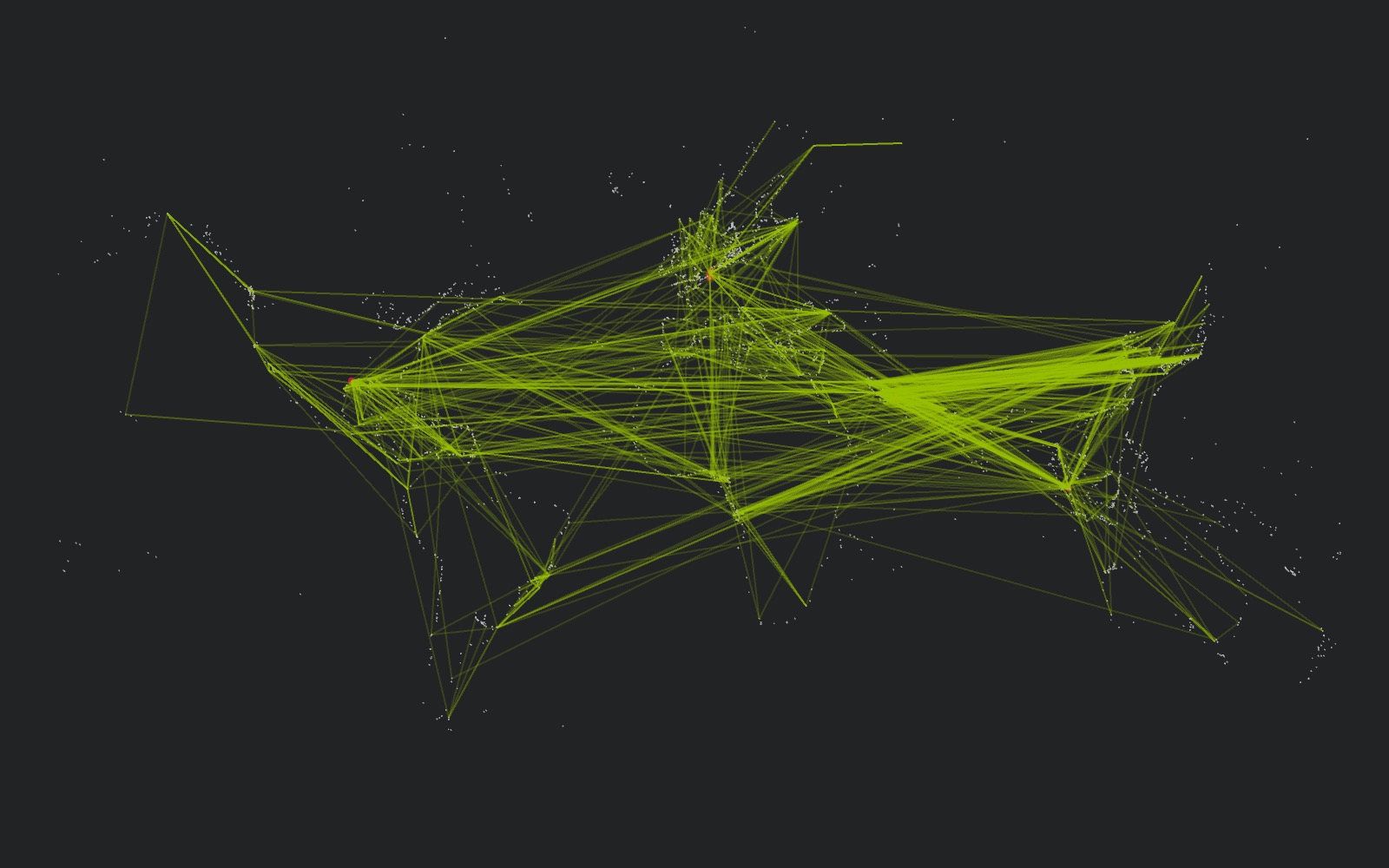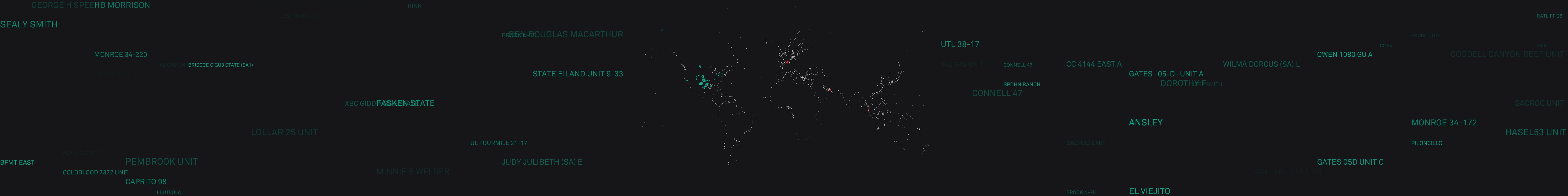 Probably my favourite parts of this project were the happy accidents that appeared as I started to play around visualising the data. Firstly there is no map displayed at any point. Instead the map of the world is creatad entirely by the small dots making up each of the ports around the world. Secondly, as I was working on a land avoidance system that the ships could follow, I created a kind of "crow flies" visualisation of various types of shipping routes, something that I thought the client wouldn't be into. As it turned out they loved these crow-flies interpretaions of their data, so much so that these graphics were used as the visual for the official invite to experience the visualisation during the oil forum event.